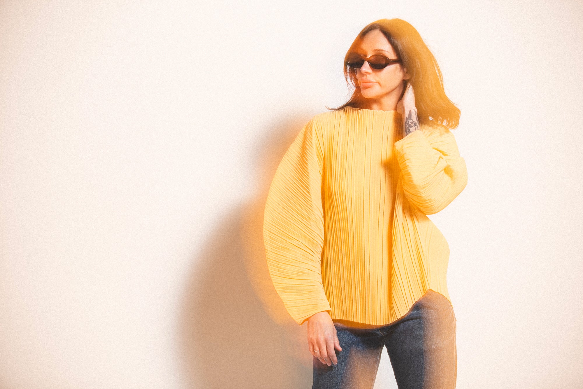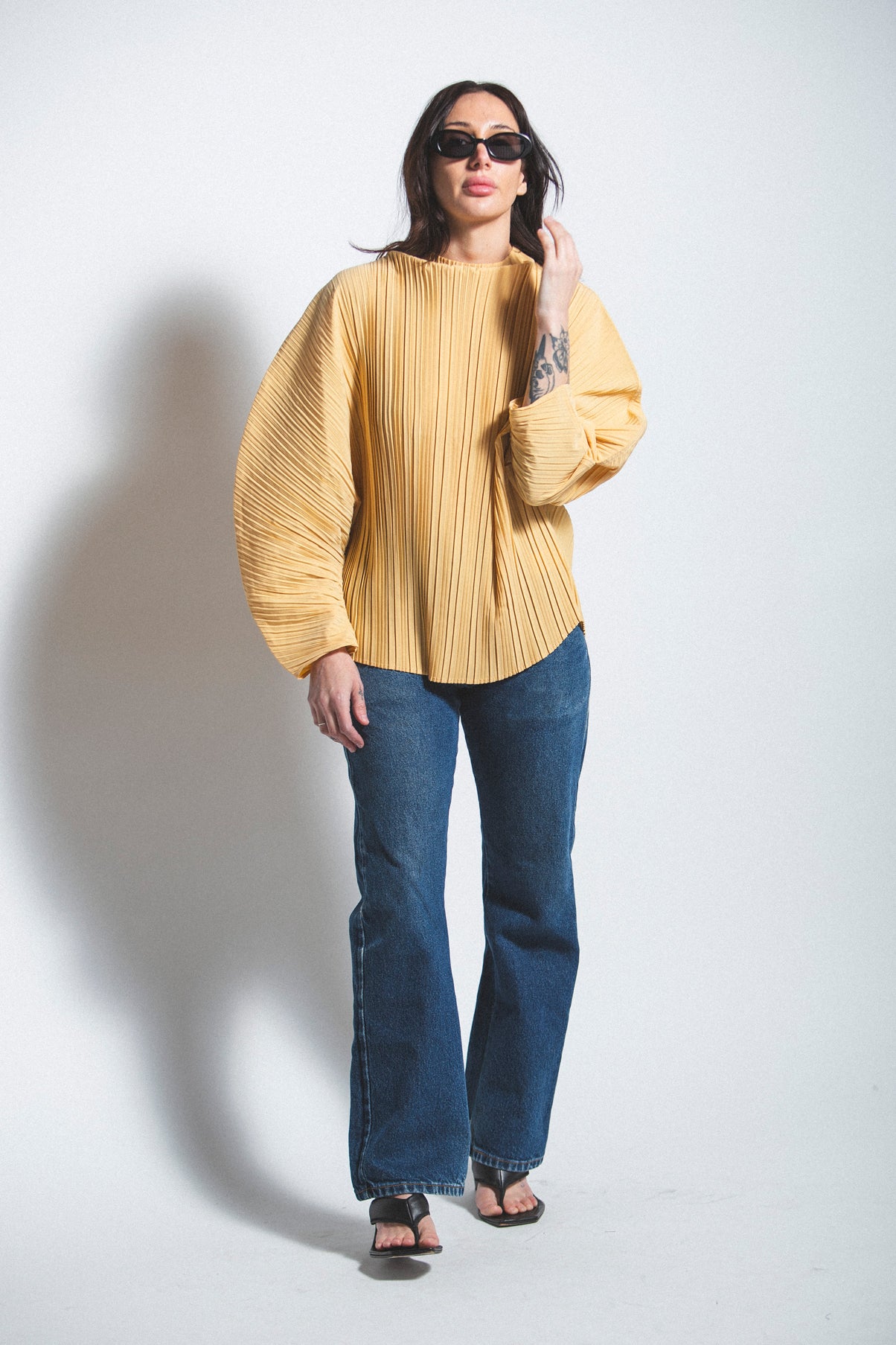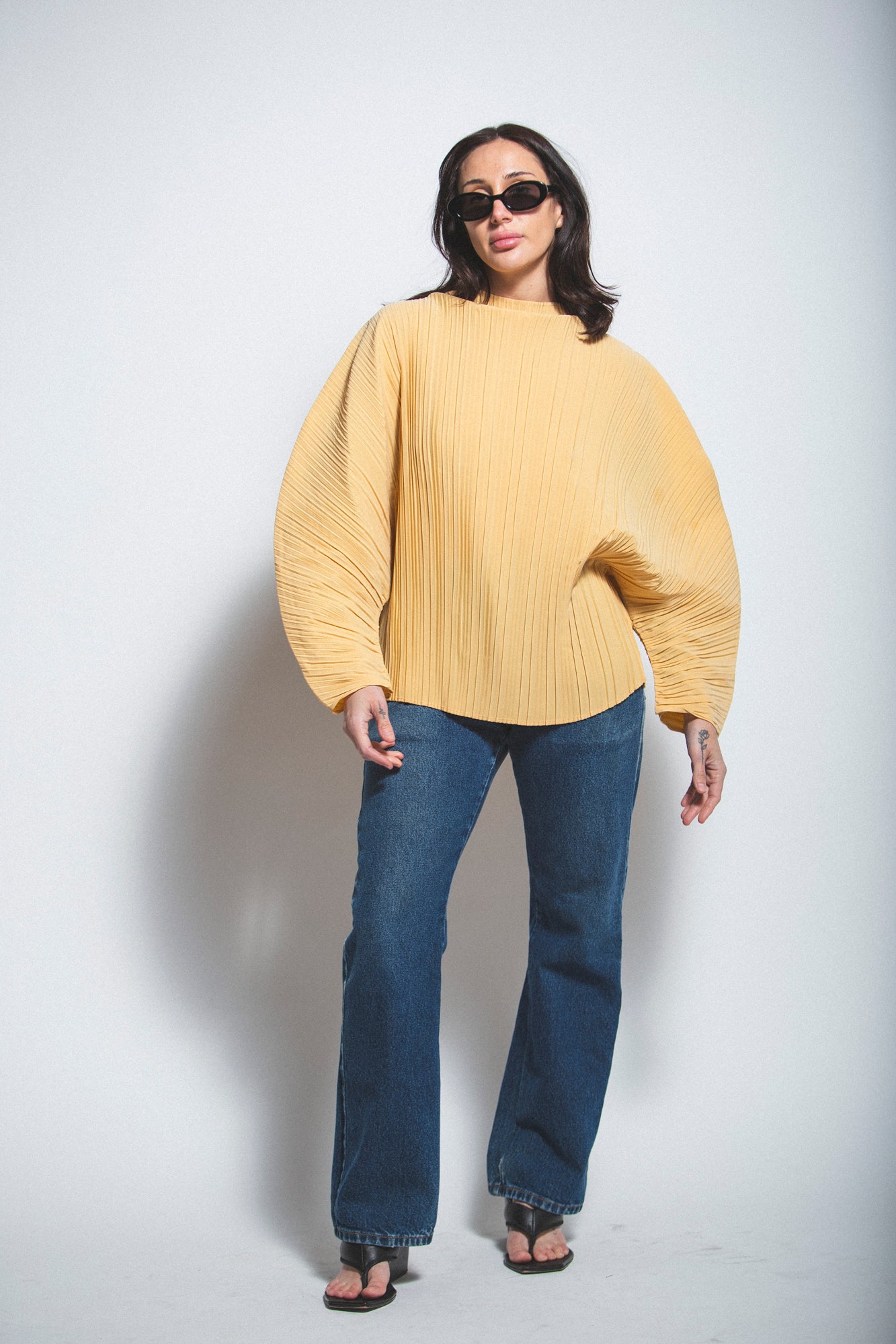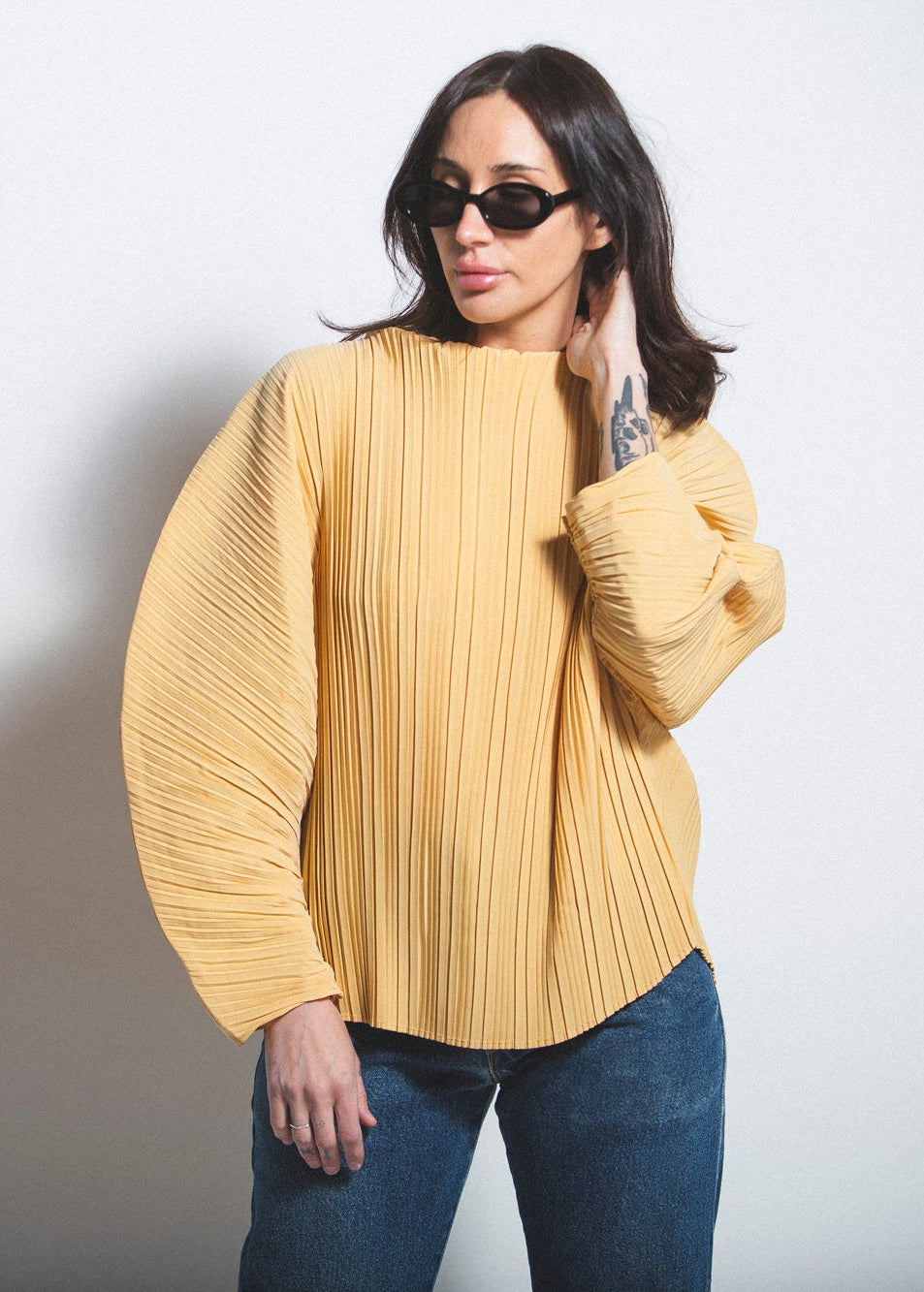 Designed for oversized structured shape. Non-stretch fabric with pleated construction and grown-on neckline for statement styling.