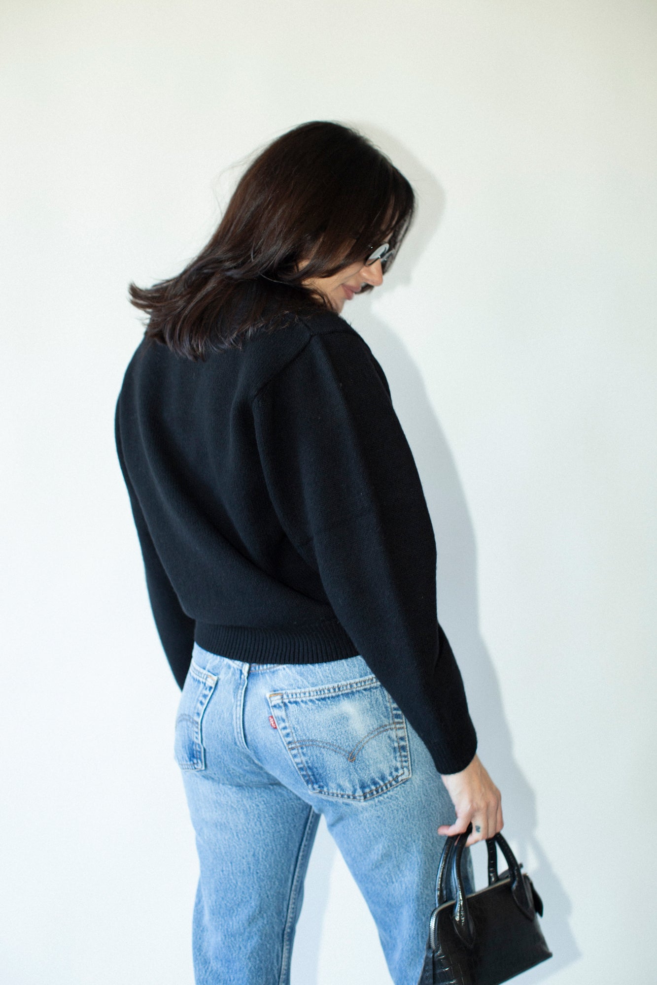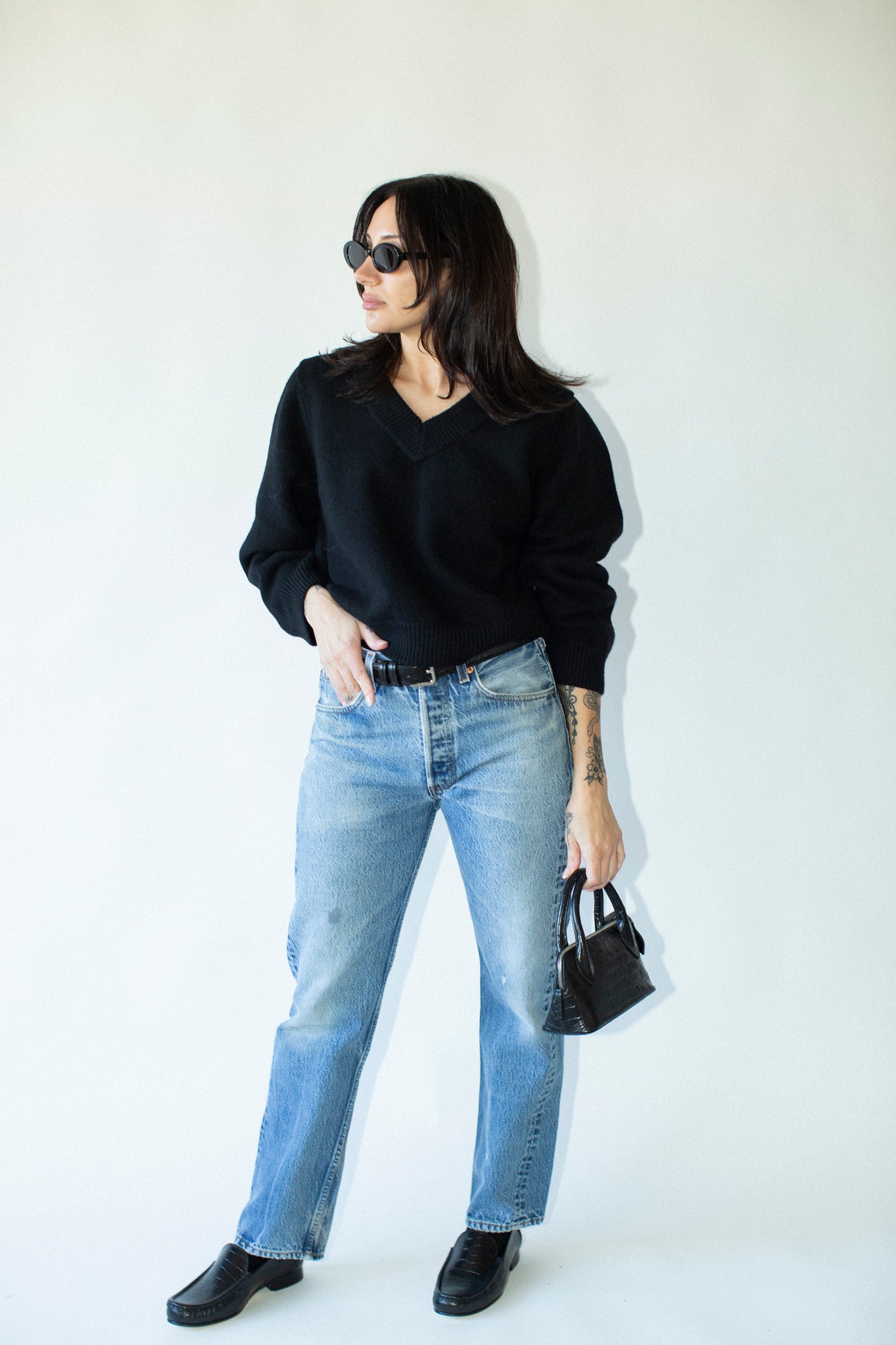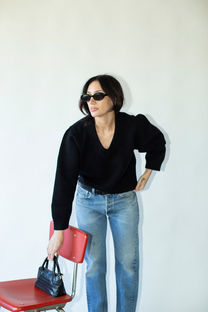 A Shrunken version of our core oversized Sloane Vee features a v-neck made from extrafine merino wool with ribbed trims.