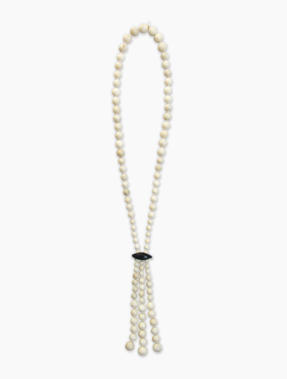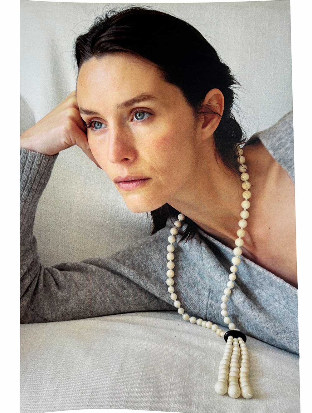 Pepita is a unique, limited-edition necklace, handcrafted with natural jade gemstone beads in a soft ivory hue, accented by an anchor link in onyx gemstone. It features a 925 sterling silver charm, plated with 18k gold in a 3-micron bath. Each piece is meticulously handcrafted in Spain using silk thread, ensuring exceptional quality and attention to detail. On average, each necklace spends about two hours in hands during the crafting process before it is ready to be yours.