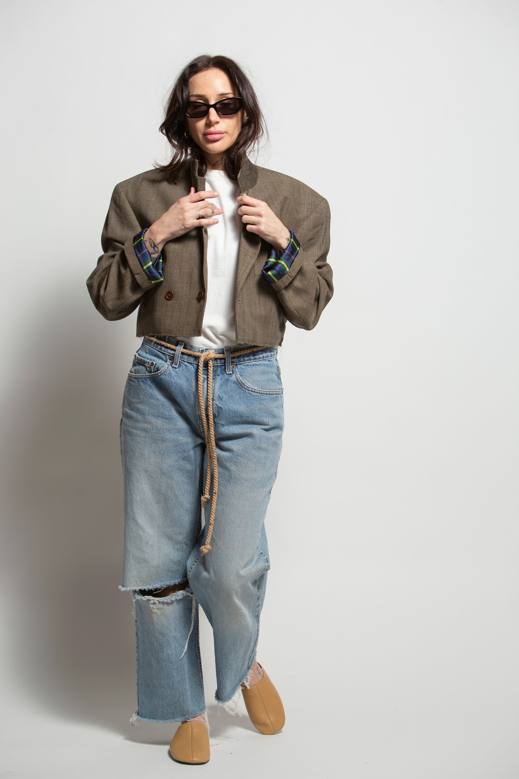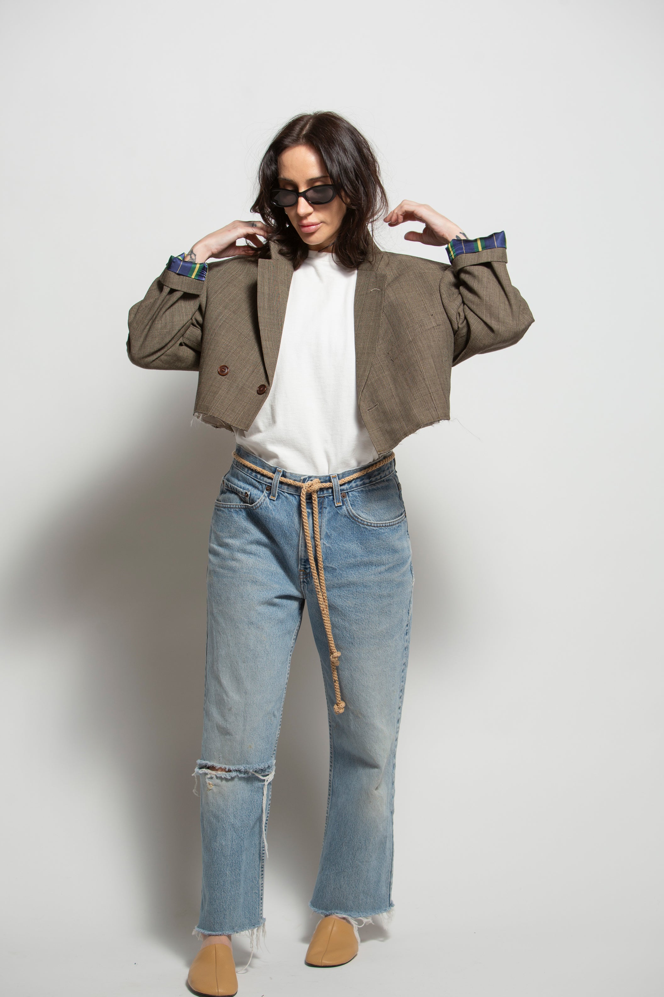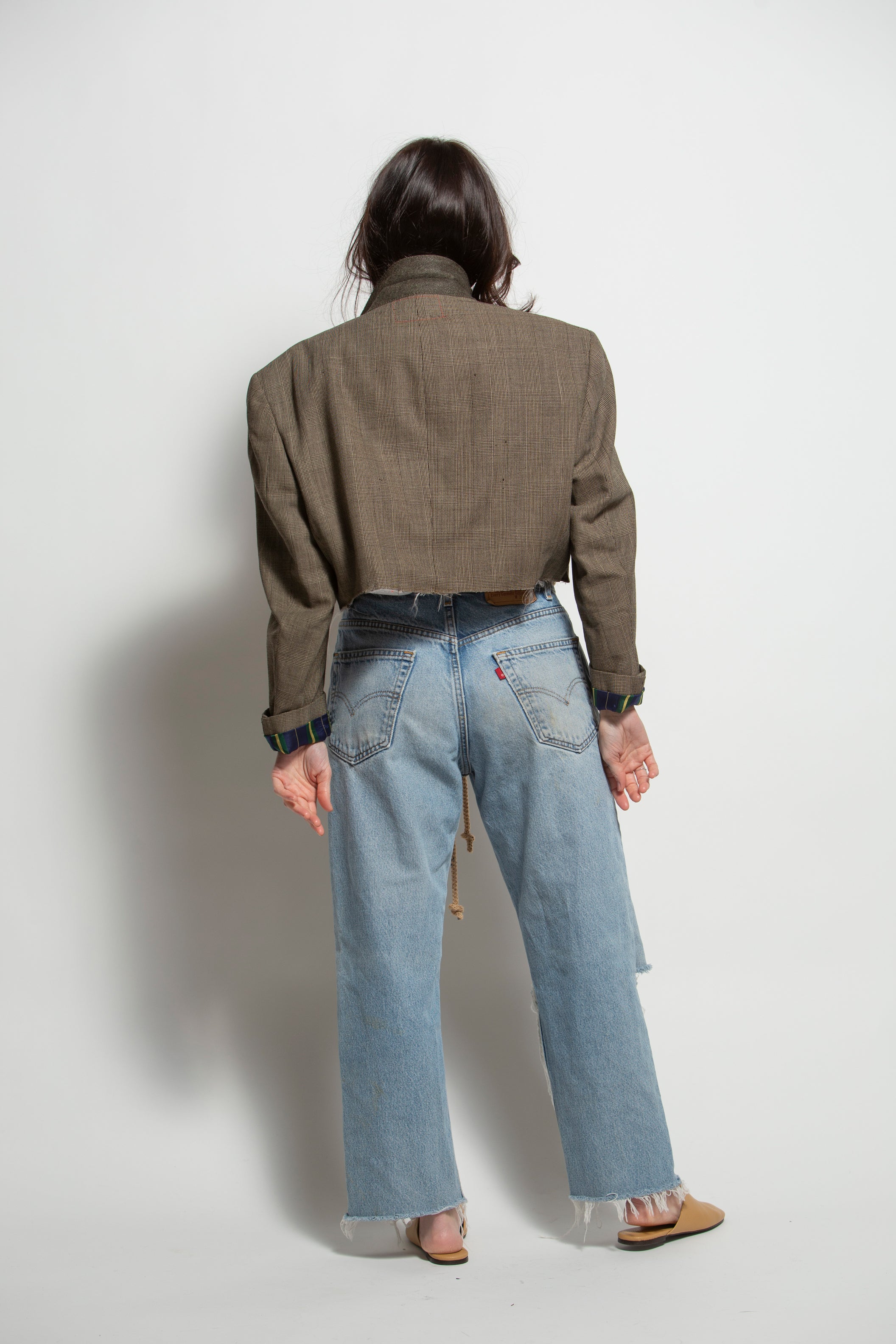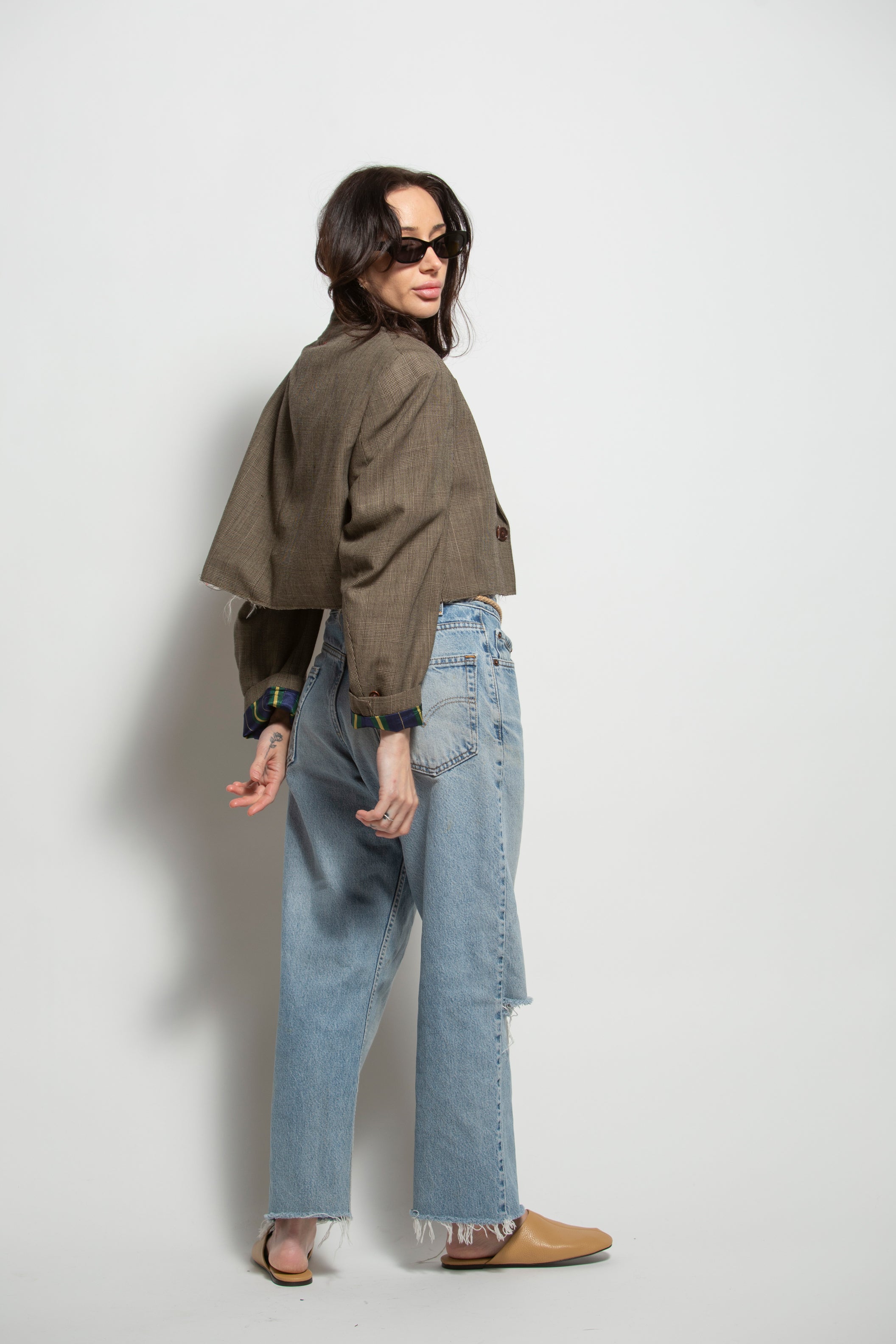 Created in collaboration with Connor Grau, originally conceptualized with Makaila Hanley, our Deconstructed Cropped Blazer is a one-of-a-kind piece transformed from hand-selected vintage men's blazers. Wear loose and boxy, or use the button to create a tailored look.