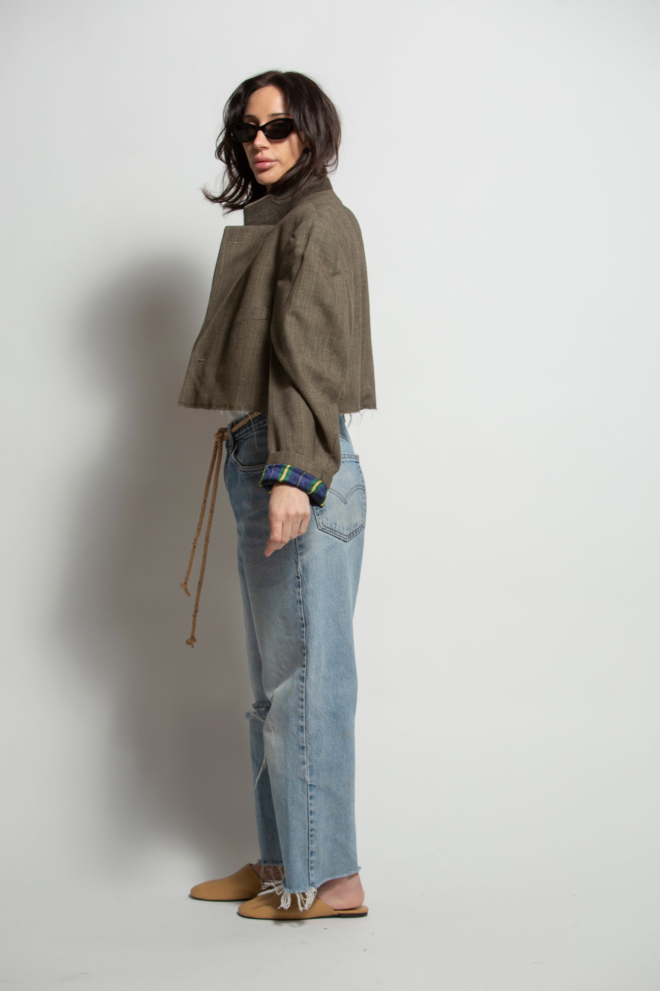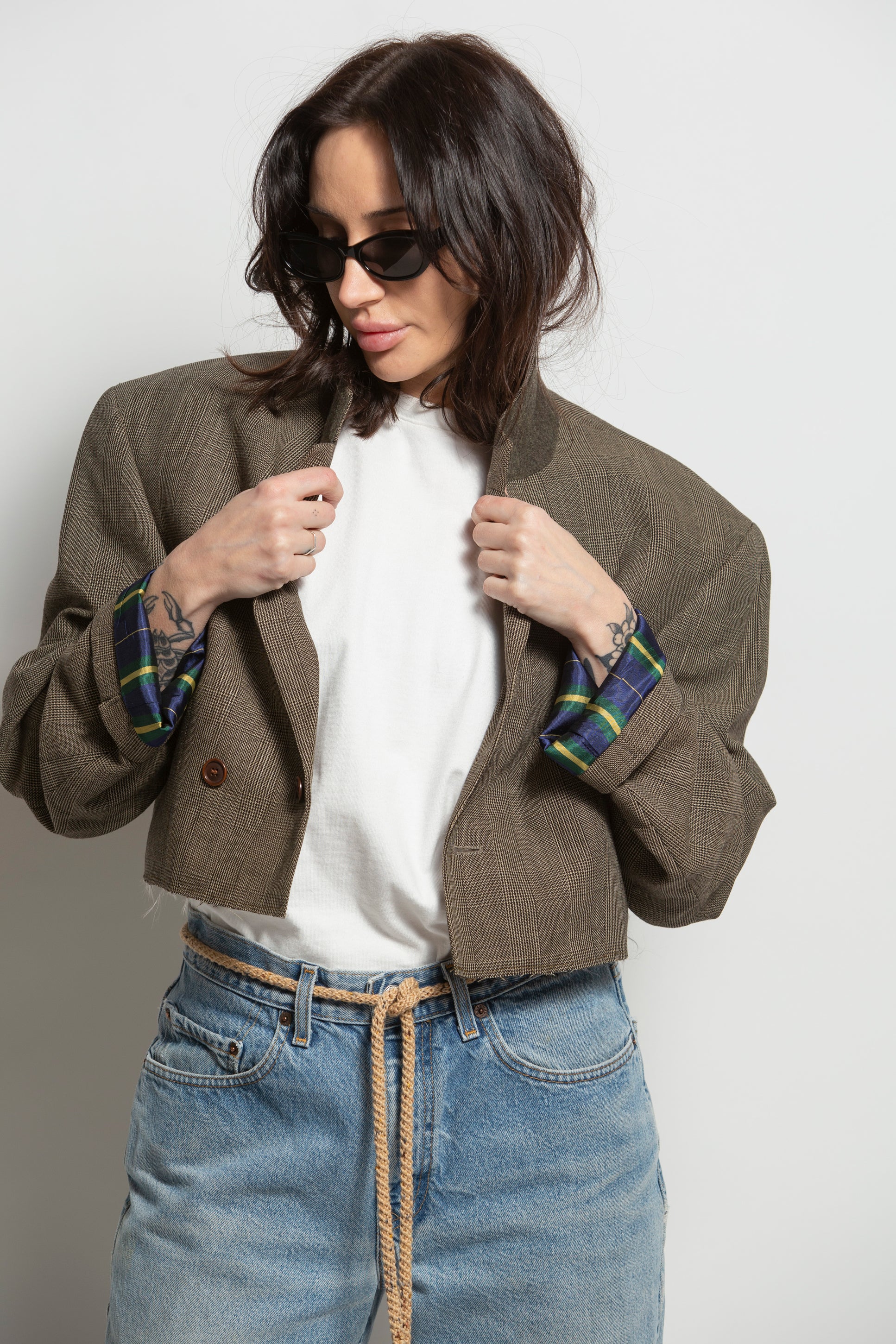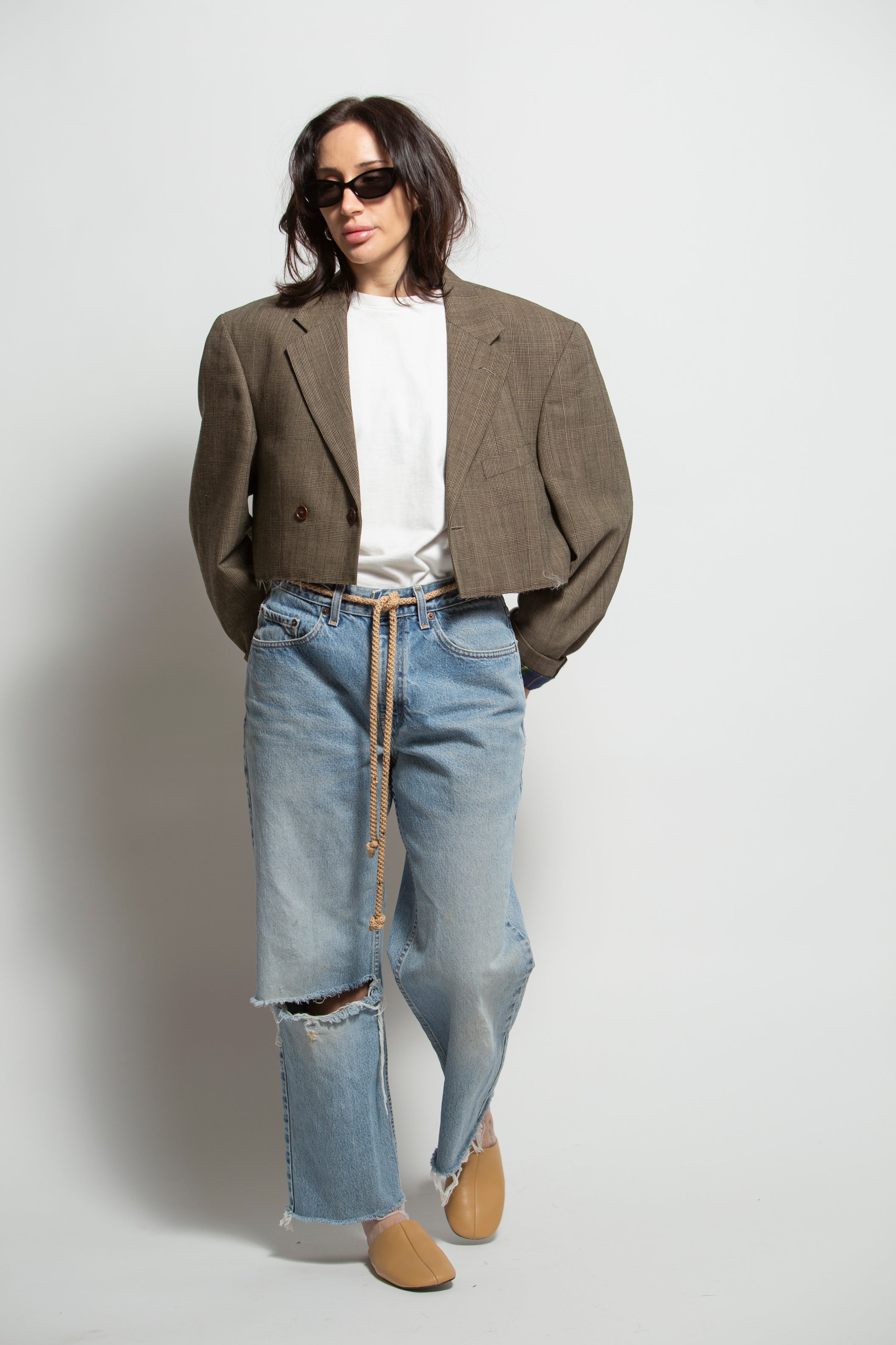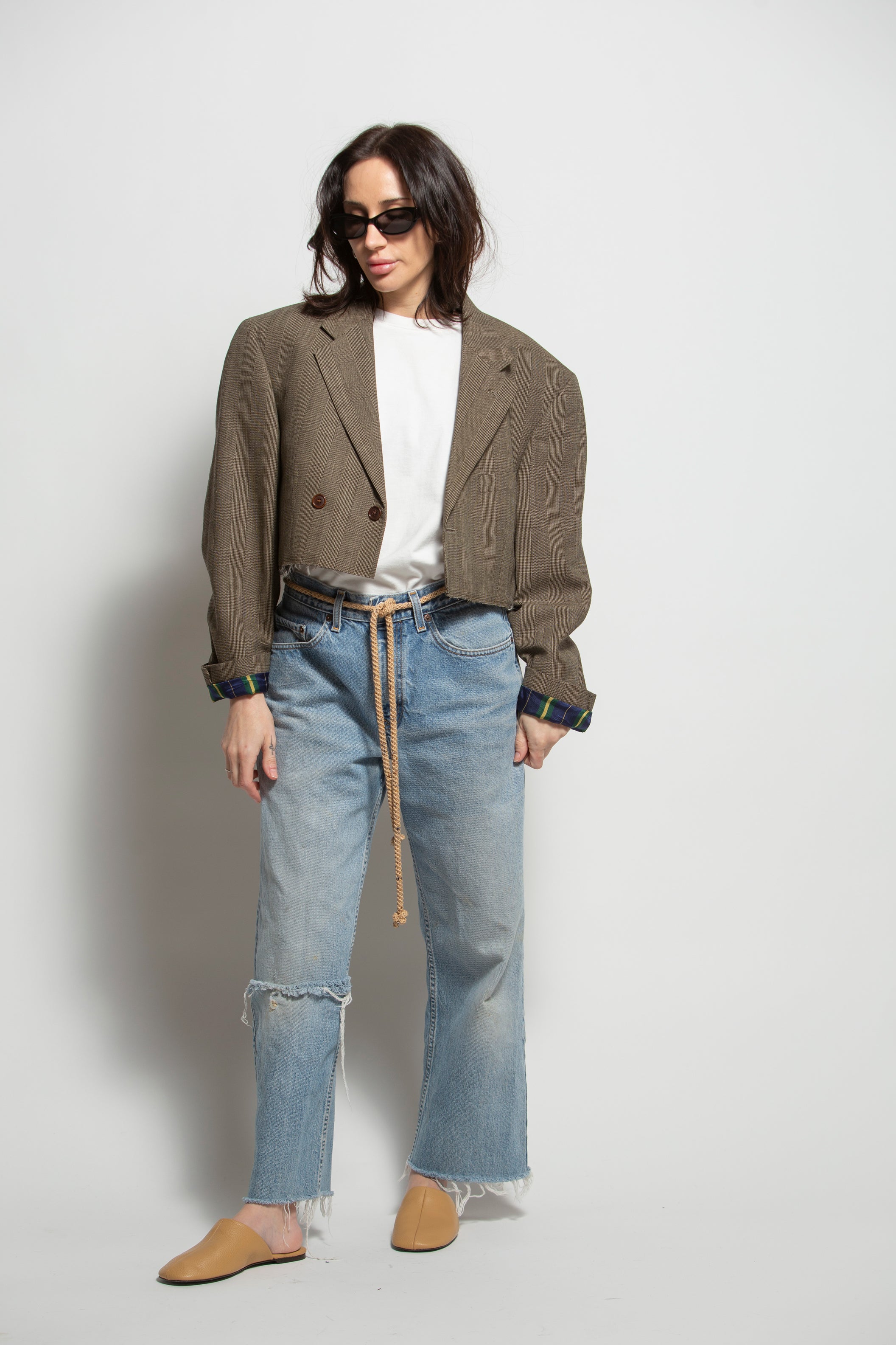 Created in collaboration with Connor Grau, originally conceptualized with Makaila Hanley, our Deconstructed Cropped Blazer is a one-of-a-kind piece transformed from hand-selected vintage men's blazers. Wear loose and boxy, or use the button to create a tailored look.
