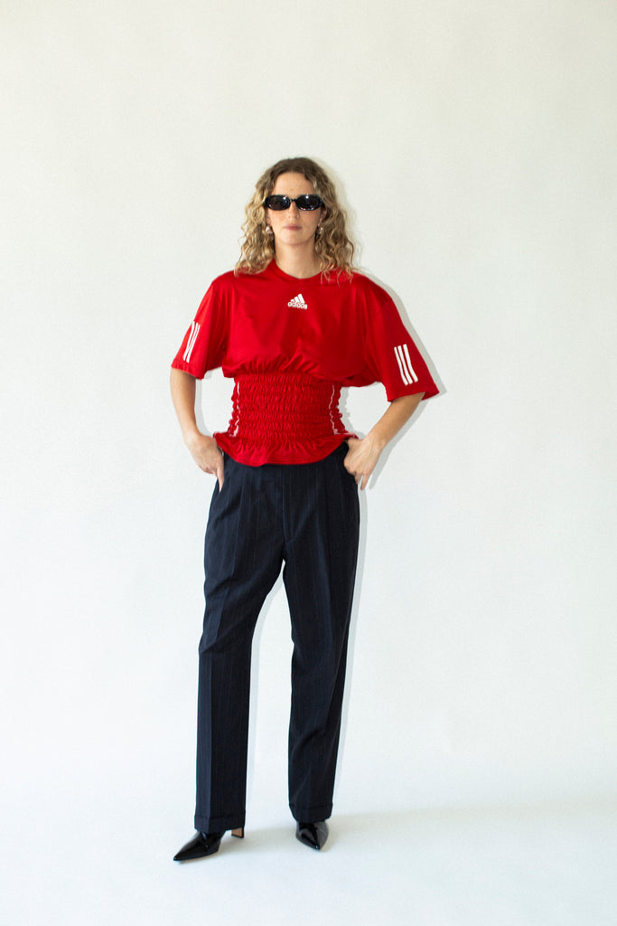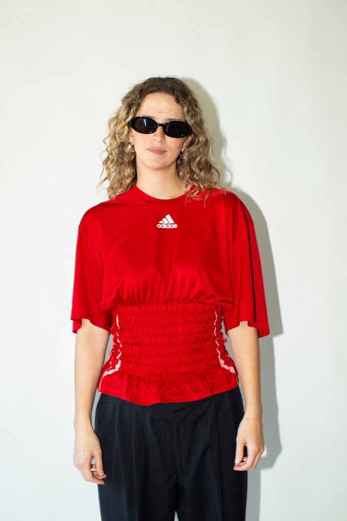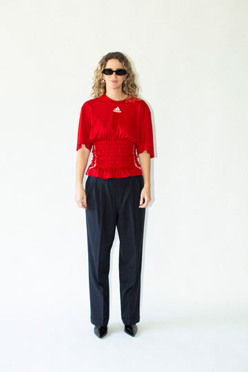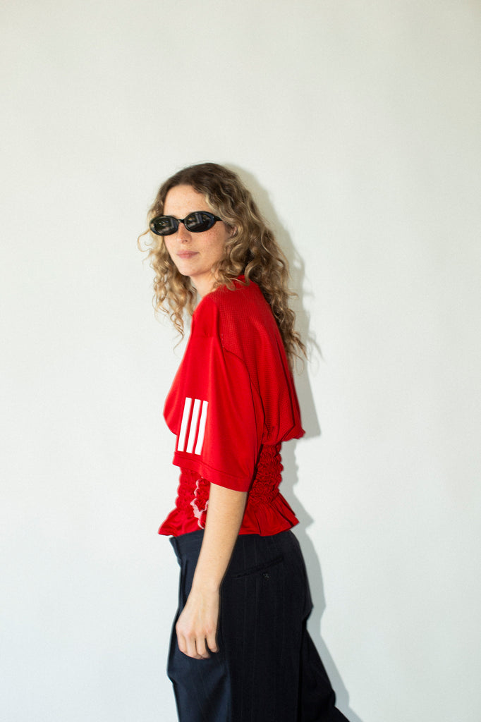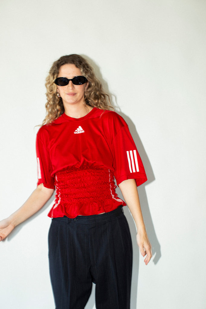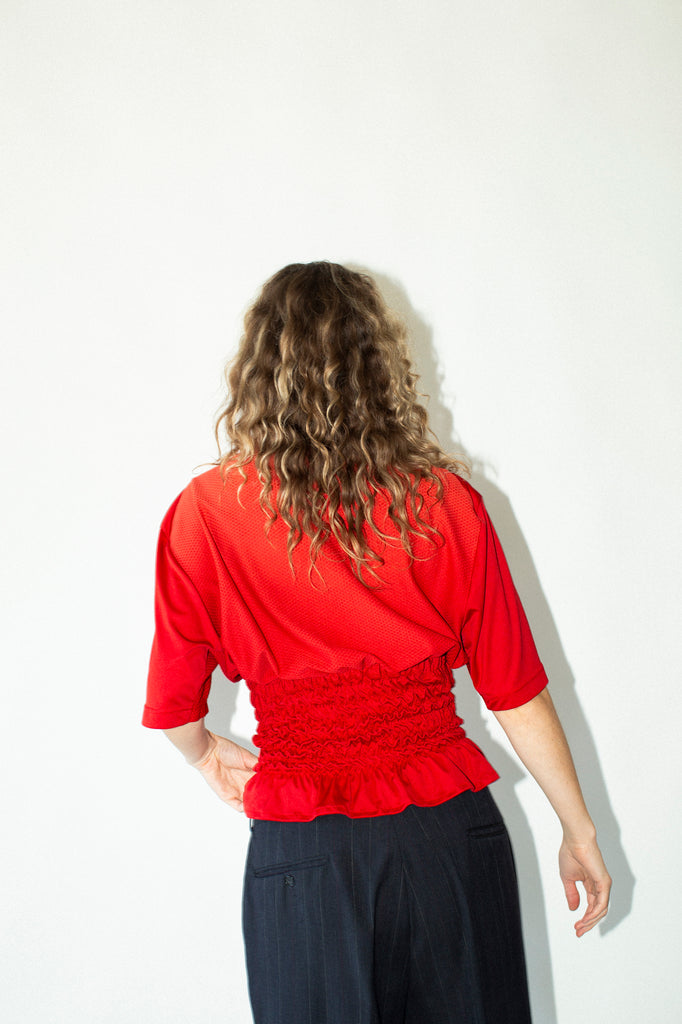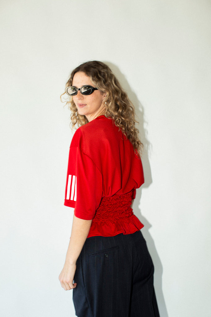 Created in collaboration with Makaila Hanley, our Smocked Jerseys are made from hand-selected, recycled athletic wear. Fitted below the bust, with a peplum hem, these tees are the perfect casual/cool look.