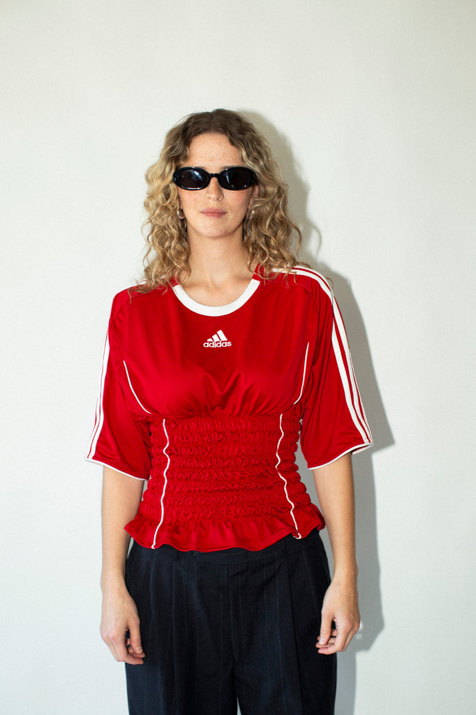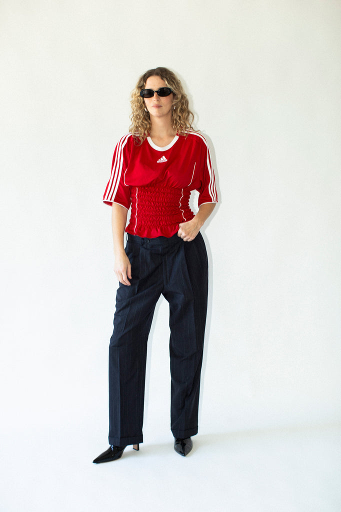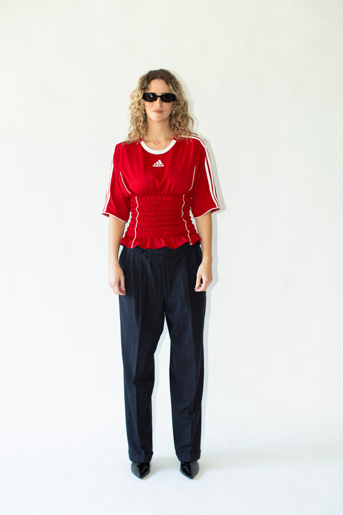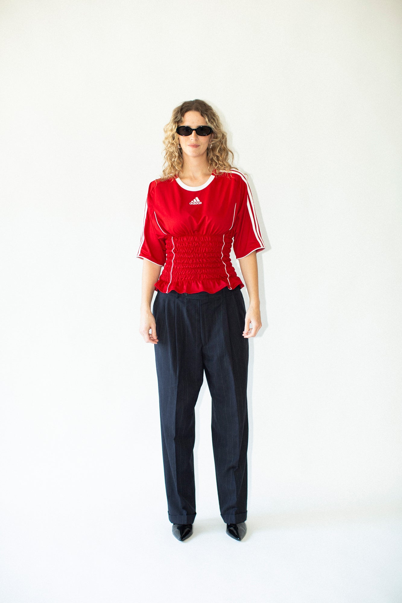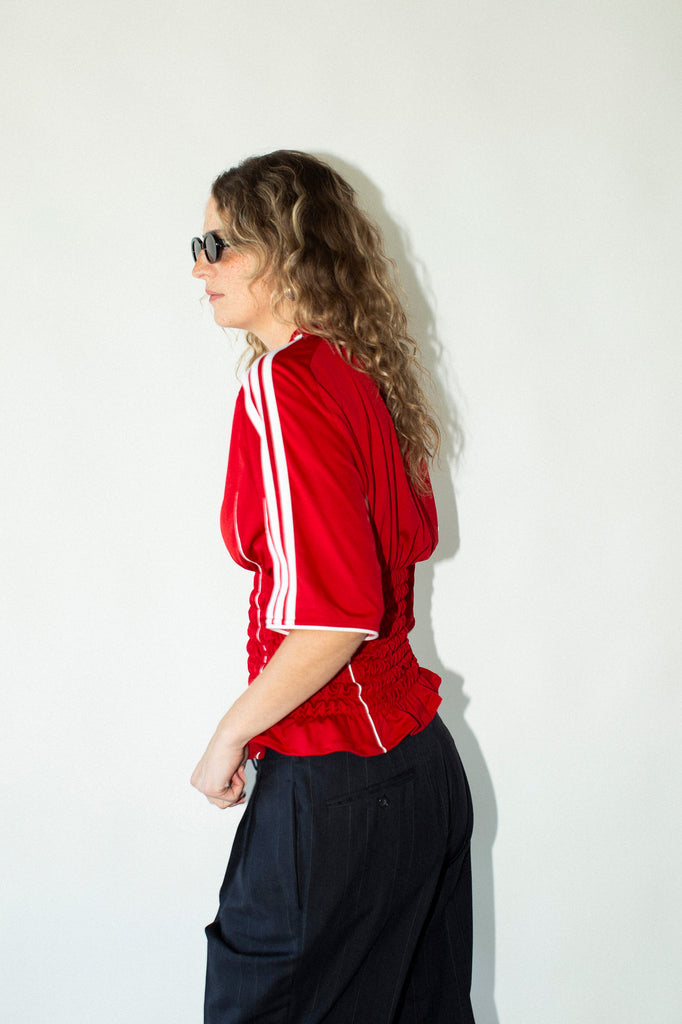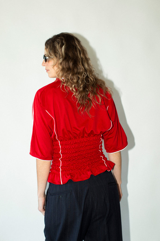 Created in collaboration with Makaila Hanley, our Smocked Jerseys are made from hand-selected, recycled athletic wear. Fitted below the bust, with a peplum hem, these tees are the perfect casual/cool look.