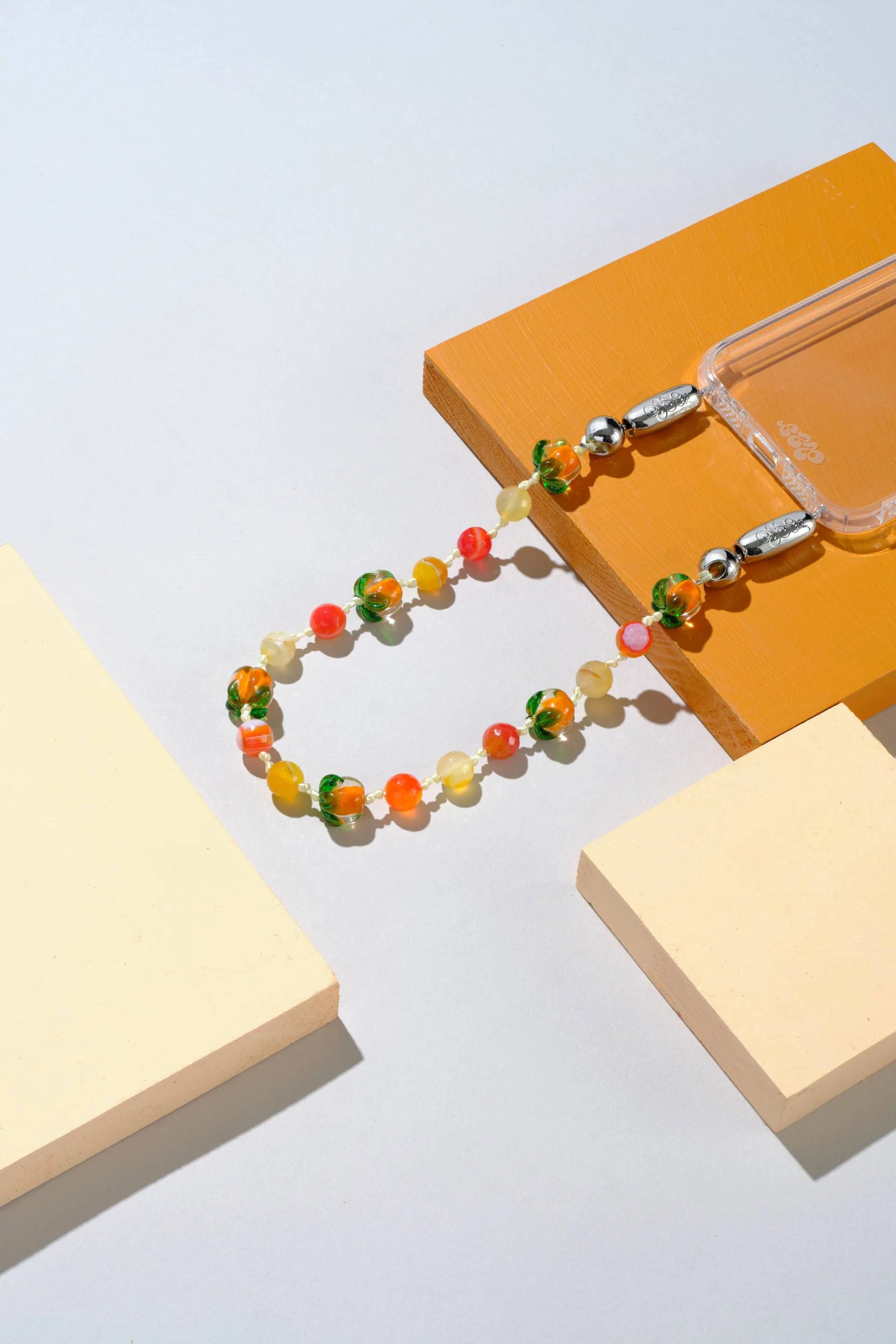 Genuine, natural gemstone beads with fruit and vegetable charms. Strung on braided cord, double knotted between each stone.