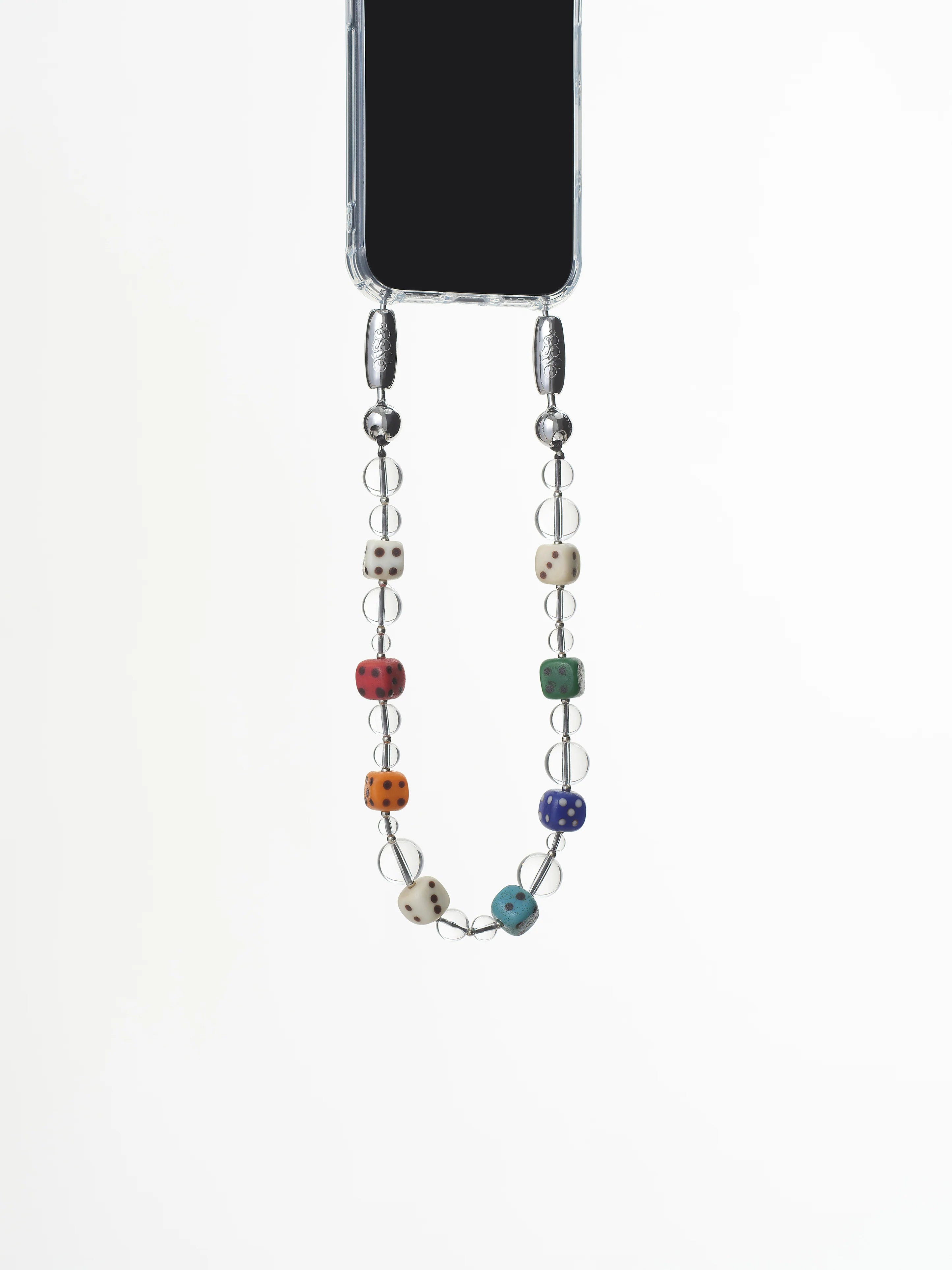 Quartz crystal gemstones, strung together with dice motifs. Metal seed bead accents.