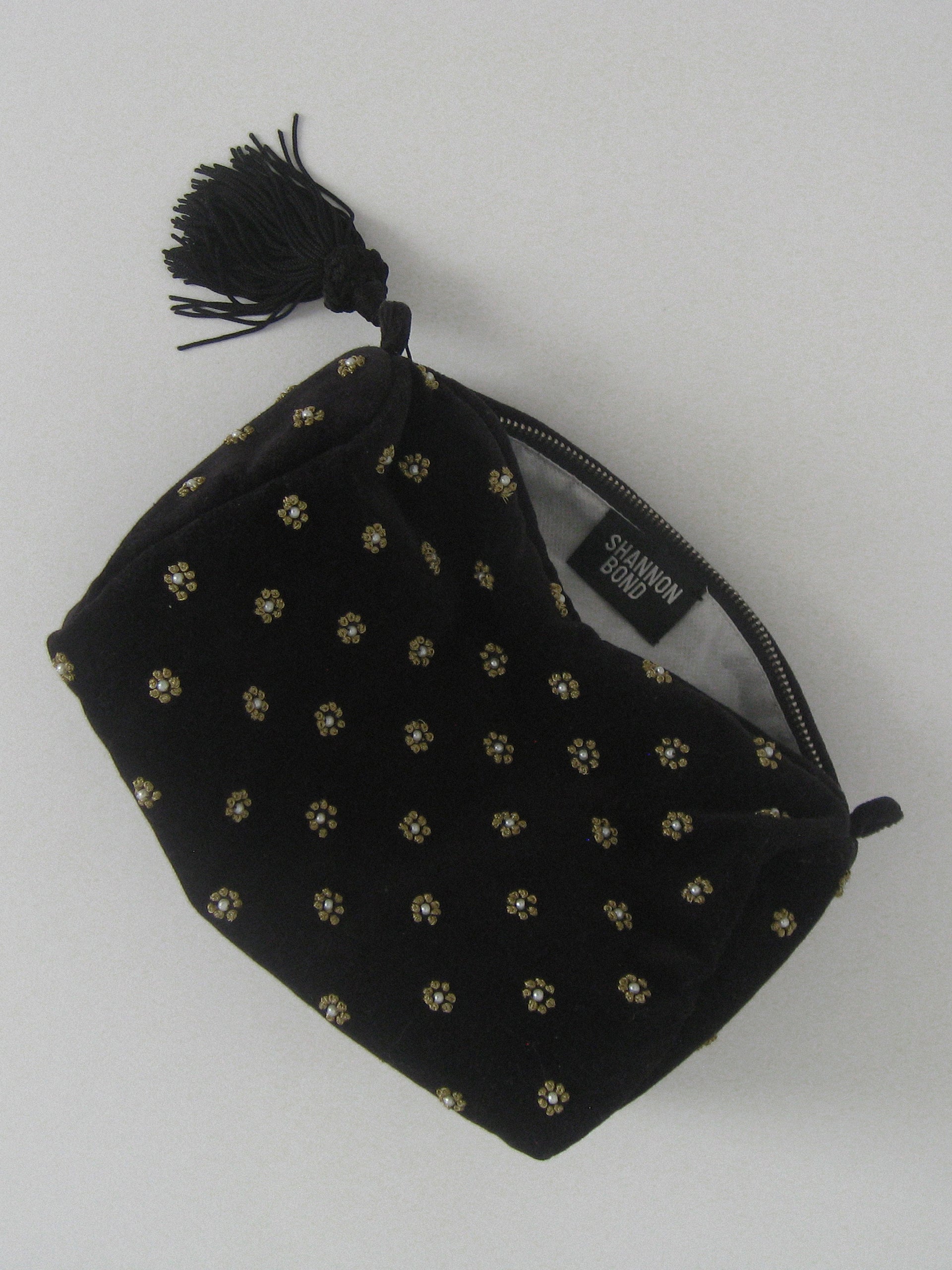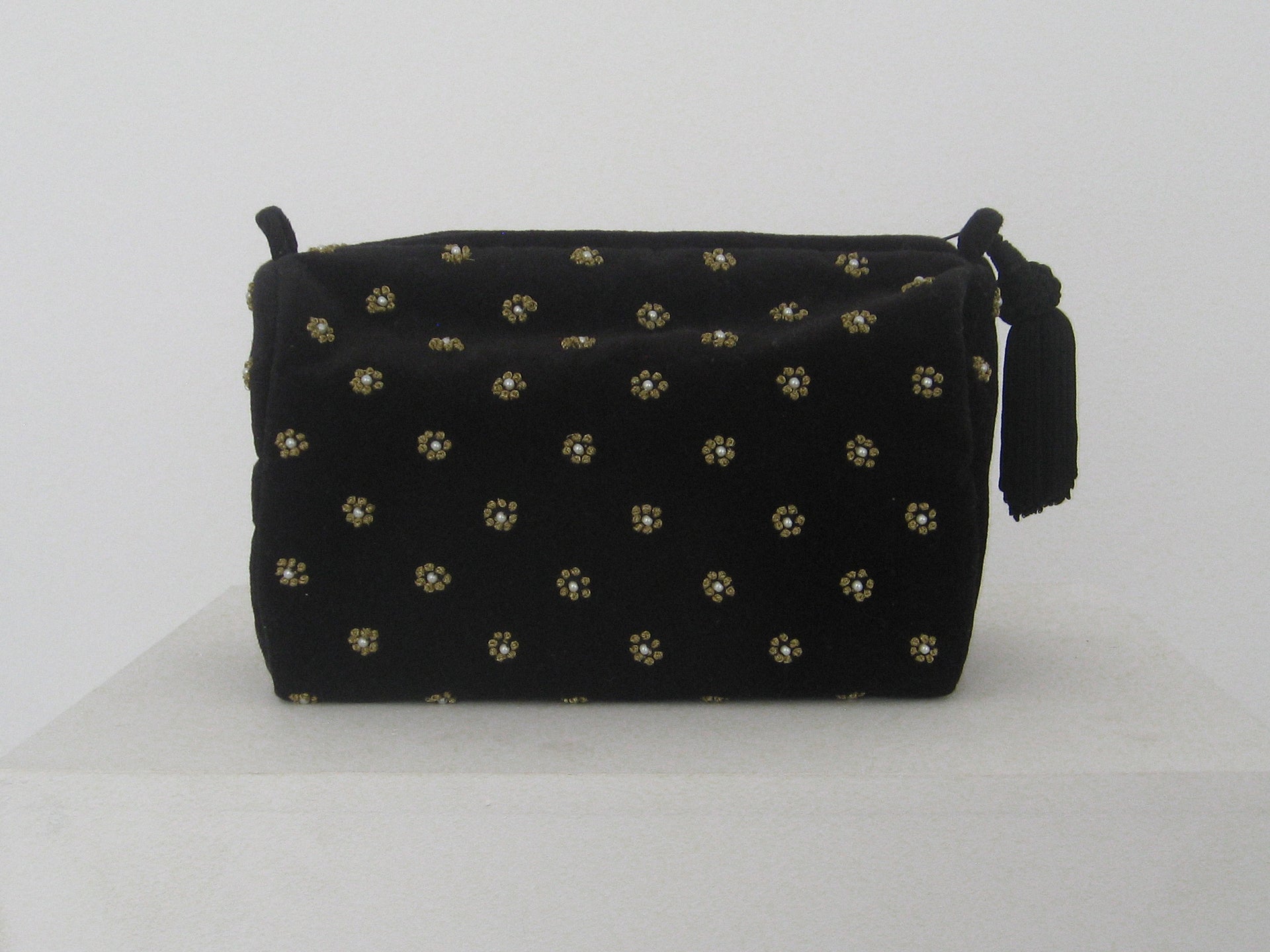 Cotton velvet cosmetic bag tassel zipper puller and all over pearl and gold metallic thread hand embroidery. Synthetic non-fabric lining is durable for cosmetics or body care products.