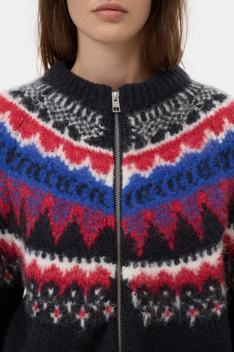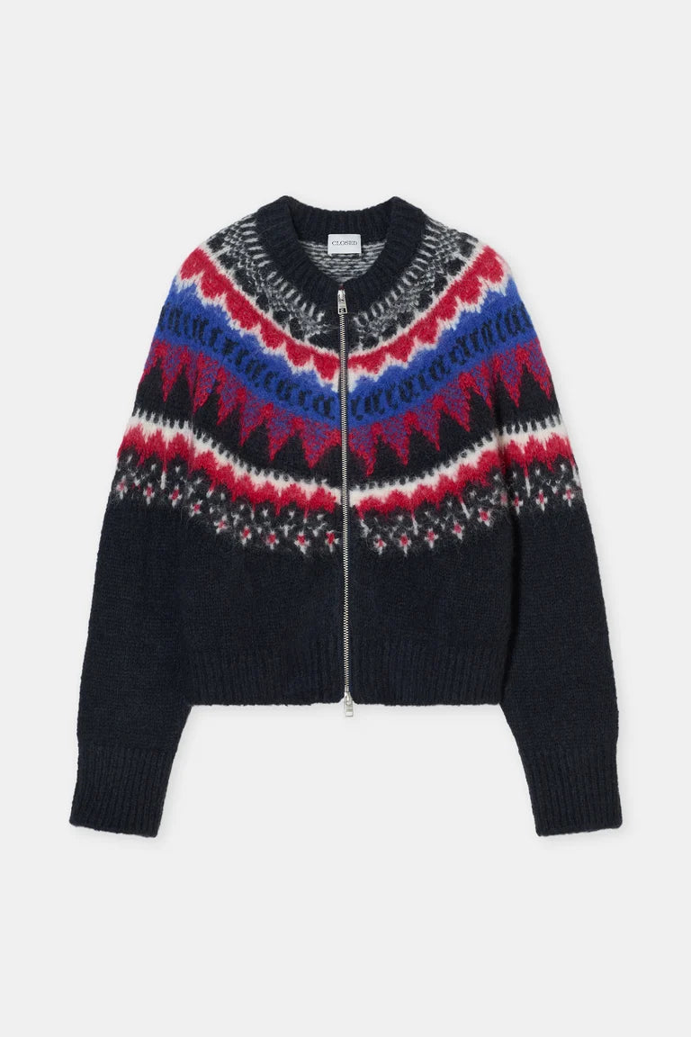 Our cropped zip cardigan features a regular fit with cropped proportions. Made in a jacquard knit with a custom-developed pattern blending three Italian yarns, adding texture and depth for a one-of-a-kind look. With a crew neck, zippered front, and ribbed trims.