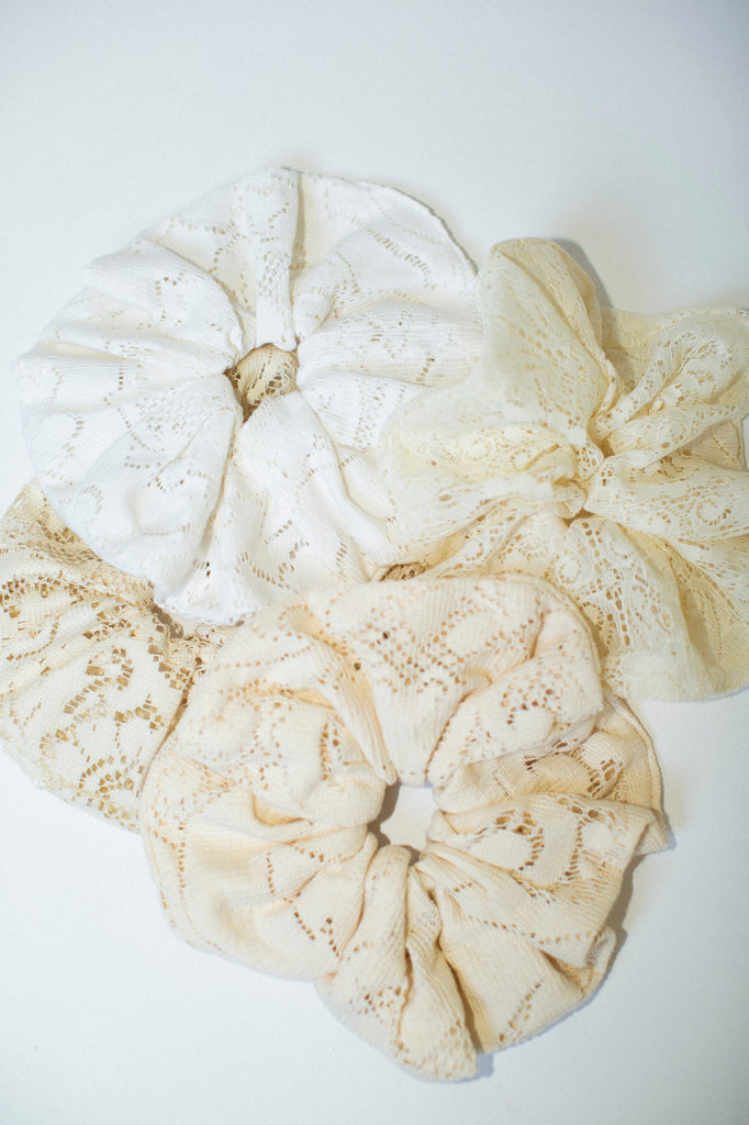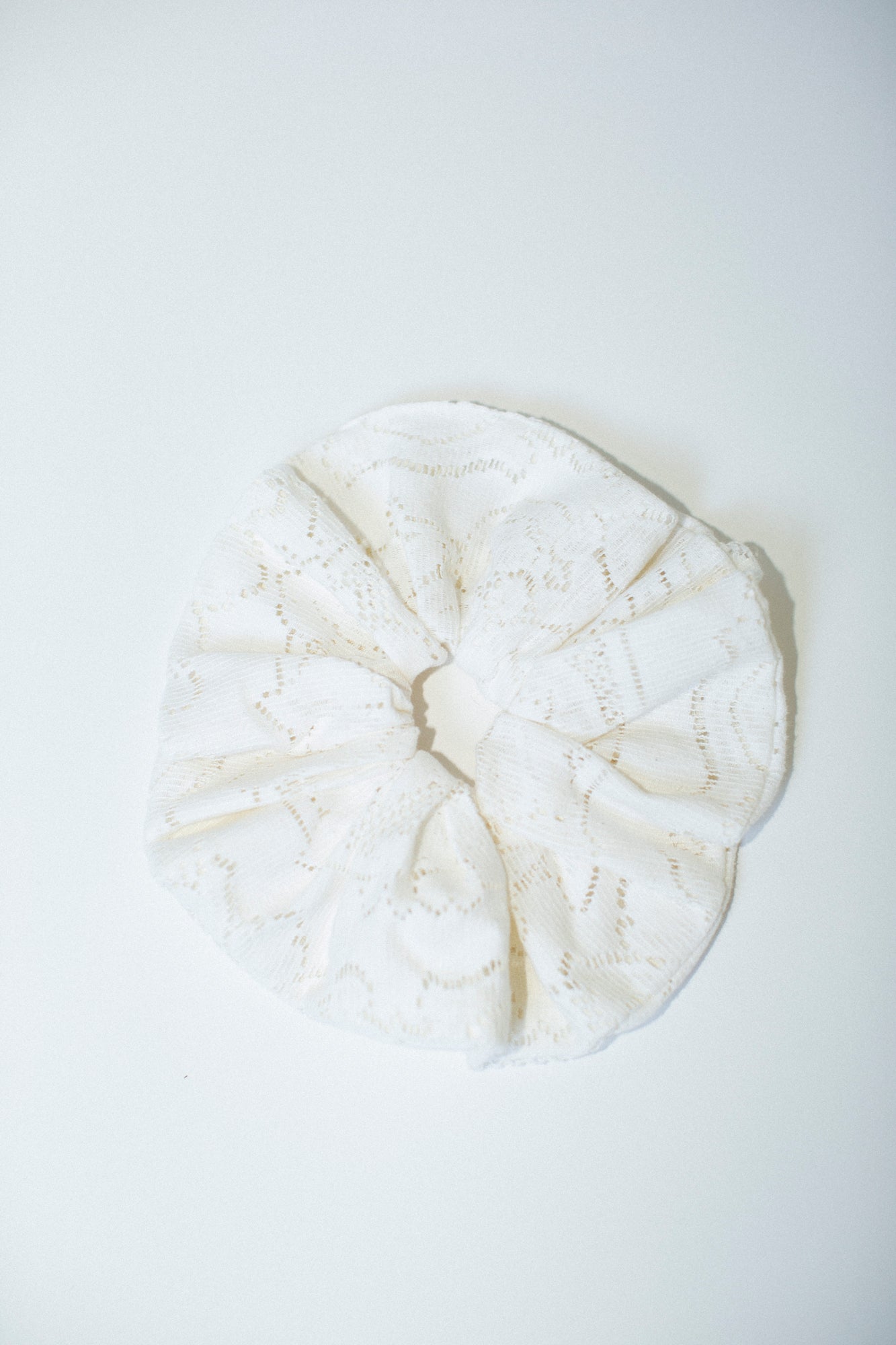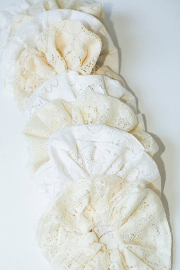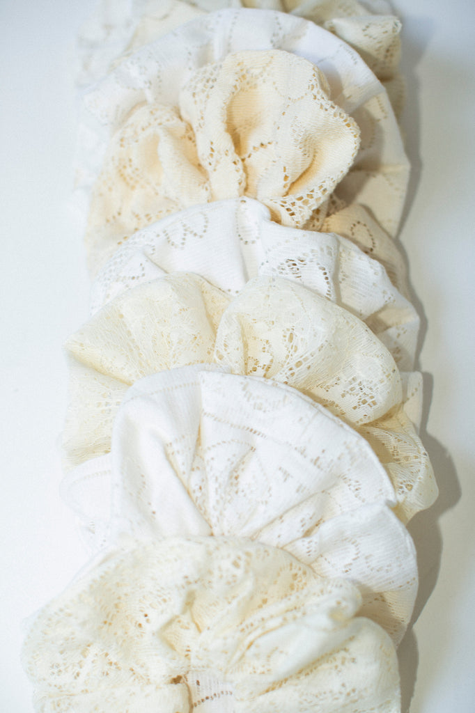 Created in collaboration with Connor Grau, our Vintage Lace Scrunchies are one-of-a-kind pieces transformed from vintage tablecloth scraps remaining from our Lace Tablecloth Tote Bags.
