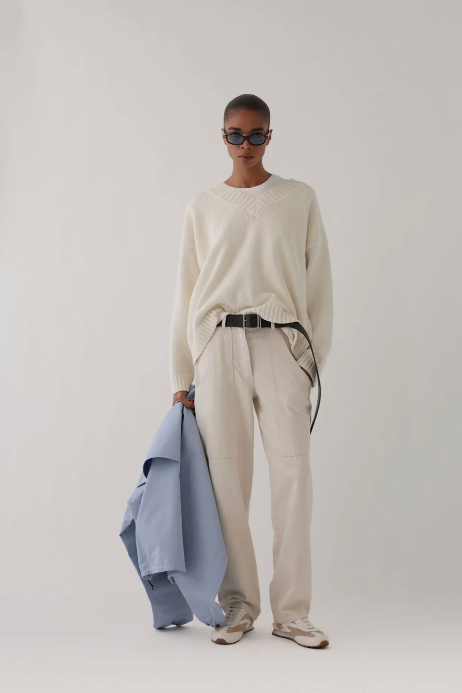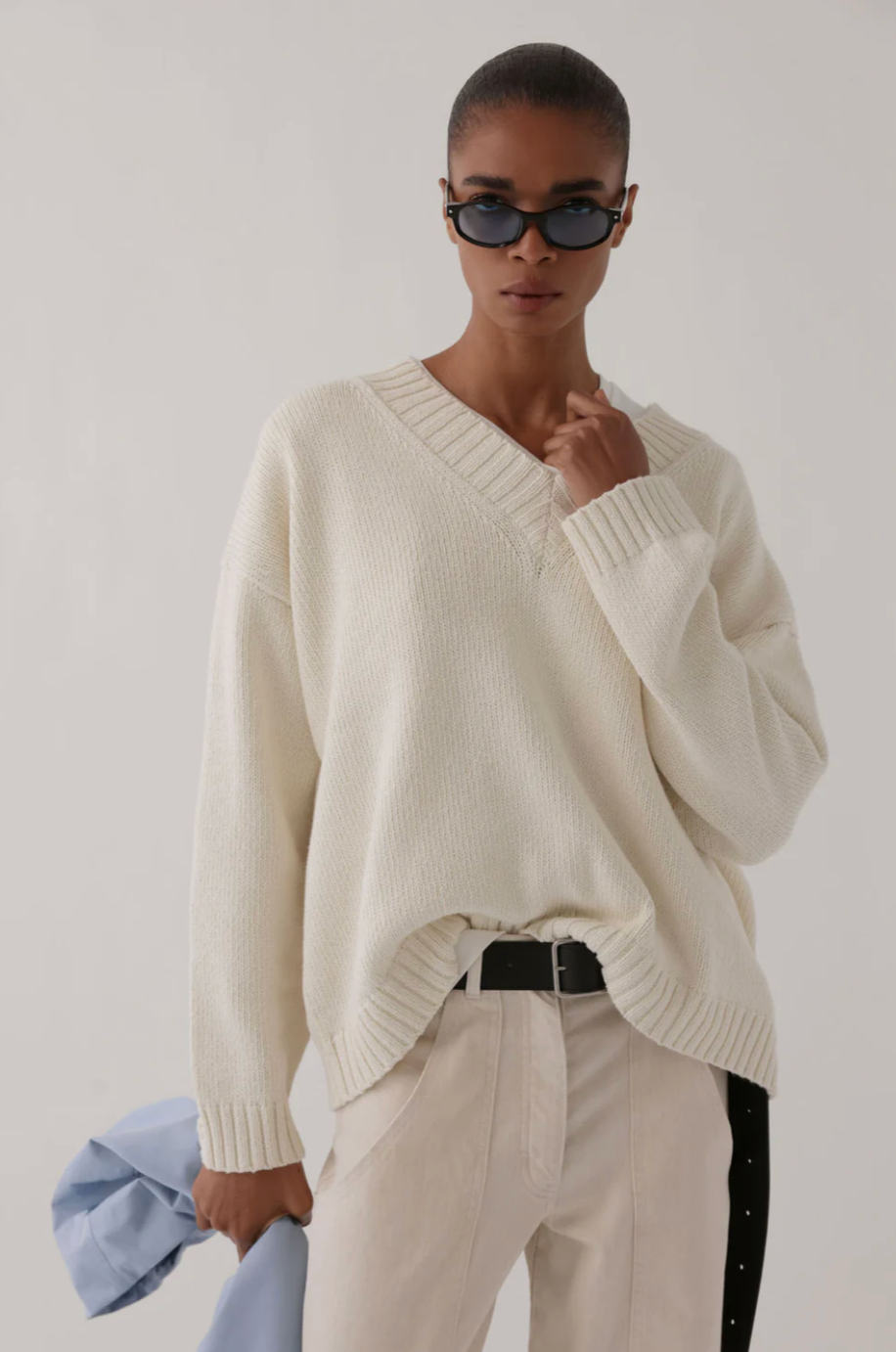 Oversized menswear fit, jersey stitch. V-neckline and ribbed trims.
