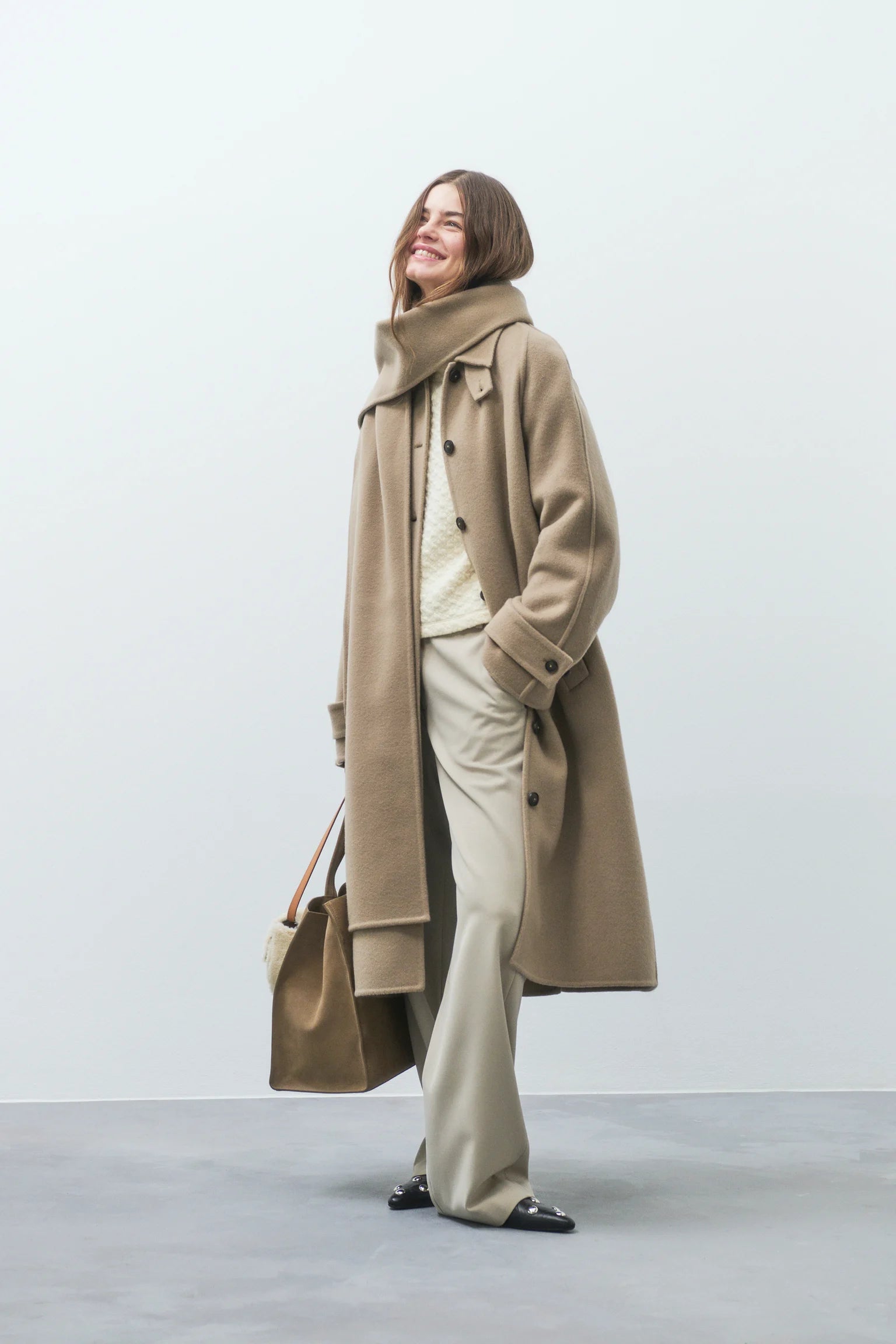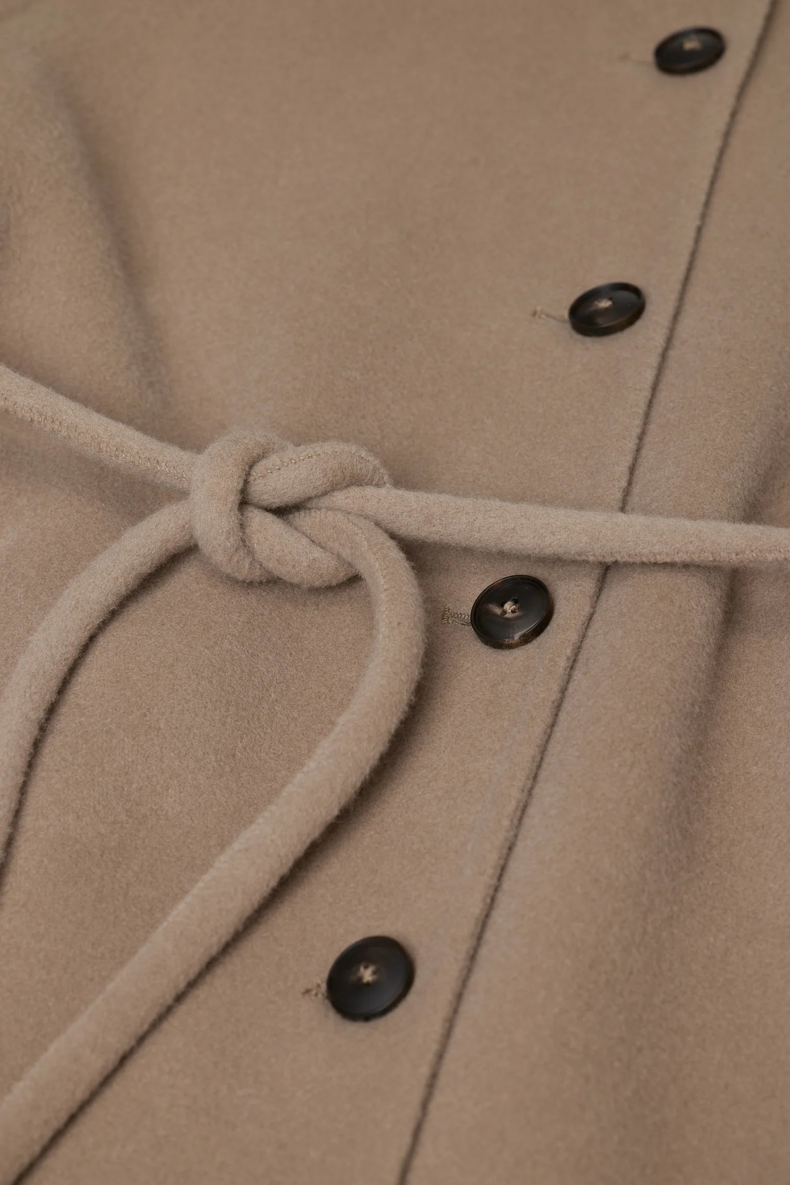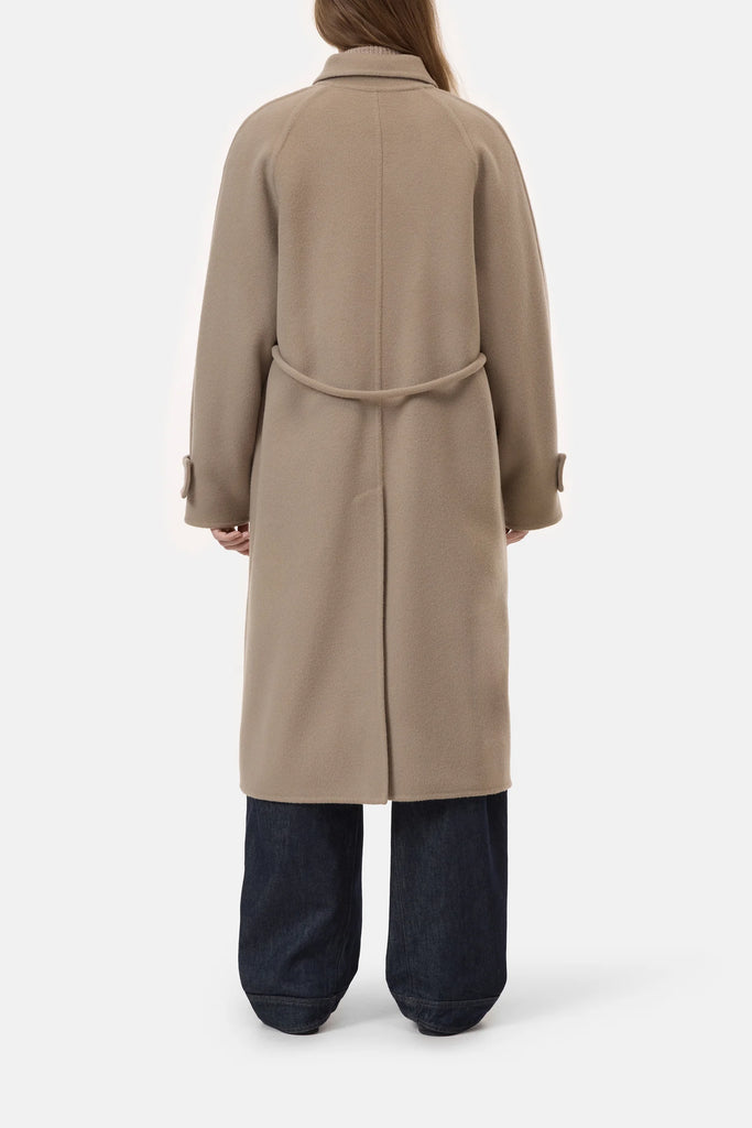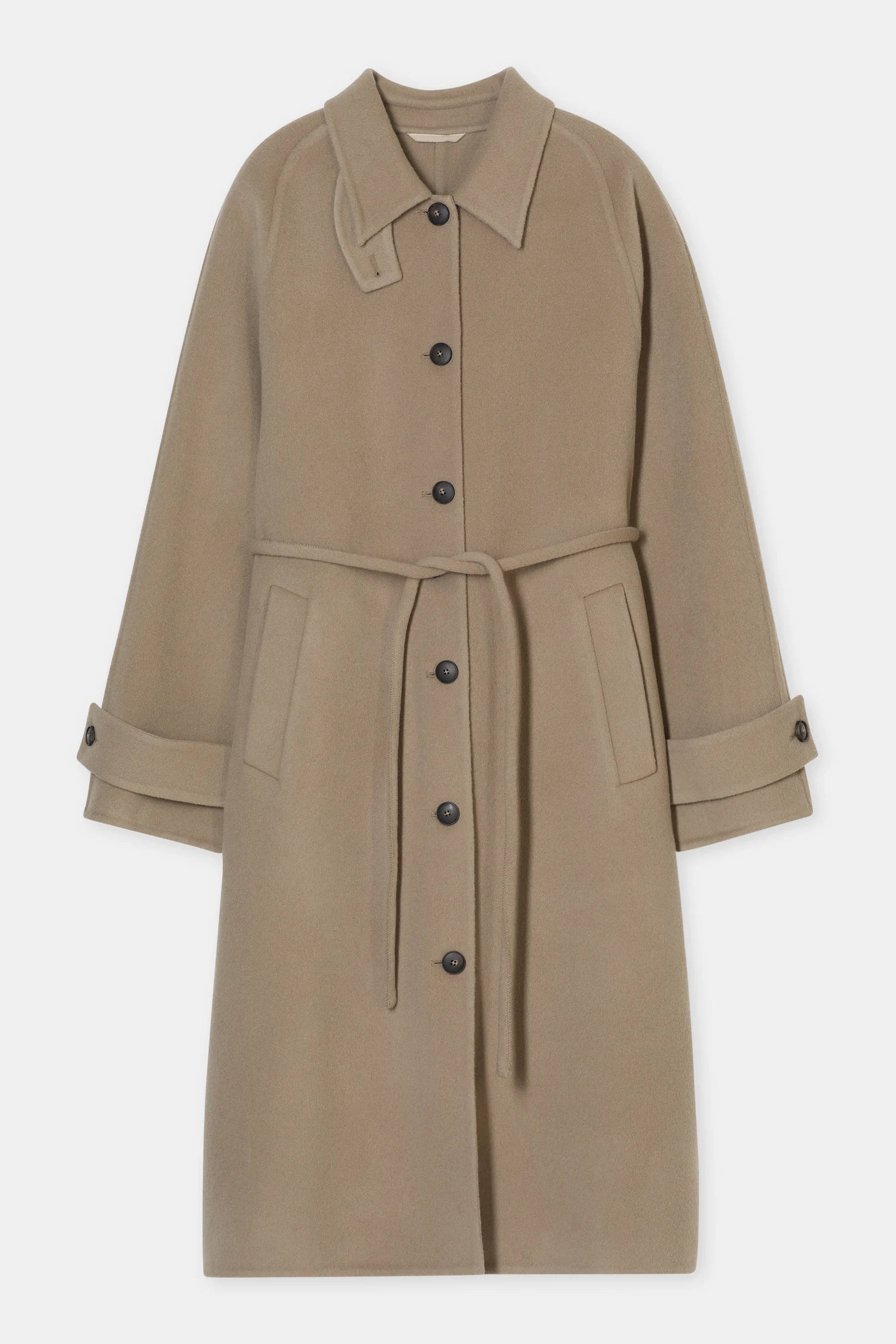 The belted coat features a regular fit with elegant drape. Made from a luxurious wool blend with a hint of cashmere in double-face craftsmanship, it has a soft, hairy texture. It includes a collar with a tab detail that can be fully buttoned up, unique slim raglan sleeve construction, buttoned cuffs, and a slim fabric belt to define the waist. The fabric is made with the sustainable ReviWool® technology: Valuable fibres from the worsting process of virgin wool are recovered and processed to create premium quality textiles with a lower environmental impact.